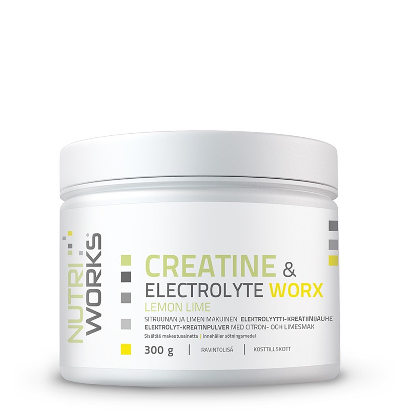 Nutri Works Creatine Electrolyte worX yhdistää kreatiinimonohydraatin ja elektrolyytit yhteen tuotteeseen. Ravintolisä – kosttillskott.
