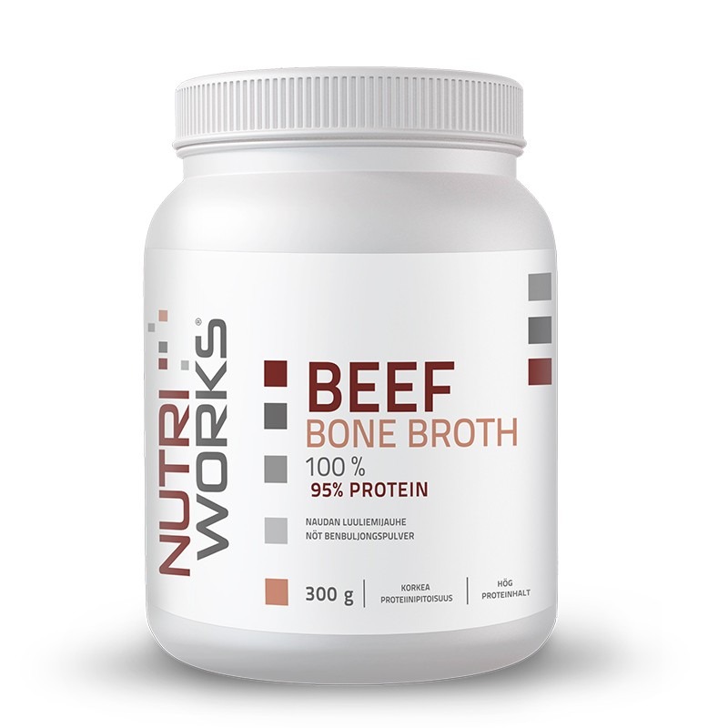 Nutri Works Beef Bone Broth 100 % (naudan luuliemijauhe) sisältää 95% proteiinia 100 grammalla.